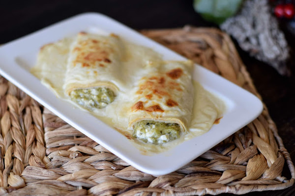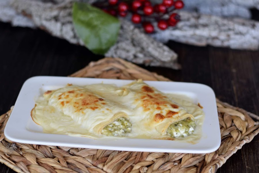 5. Colocamos parte de la masa de borraja encima de los crepes y enrollamos. Así hasta que los tengamos todos.