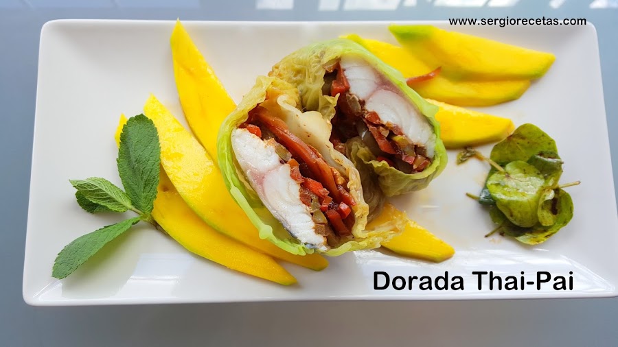 Para presentar nuestro plato, una vez pasado el tiempo de cocinado, colocaremos sobre un plato de presentación algunos filetes de mango sobre los cuales dispondremos el paquetito de "Dorada Thai-Pai" que serviremos acompañado de unas hojas de berros aliñadas y decorando con algunas hojas de menta fresca más. Servimos acompañando con un poco de la salsa de saltear las verduras y nos disponemos a disfrutar.