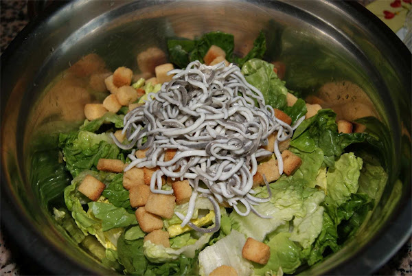 Escurrimos las angulas sucedáneas conservando el aceite, con el que vamos a preparar la salsa césar. Añadimos a la lechuga los croutons y colocamos en el centro las angulas sucedáneas.