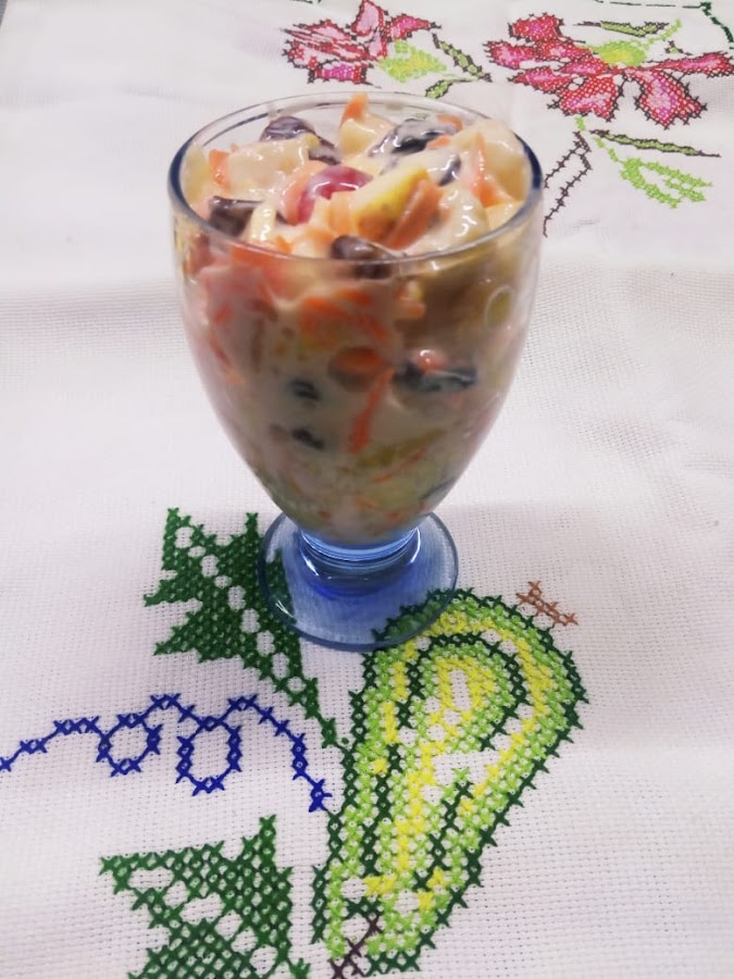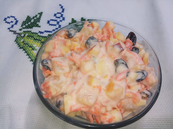5.- En un bowl agrega la zanahoria rallada, la manzana, la fruta del cóctel, nueces, pasas, leche condensada, media crema.