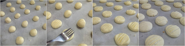 Tomamos porciones pequeñas y formamos bolitas. Las ponemos sobre papel vegetal en una bandeja para horno. Las aplastamos con un tendor, como en la foto y las cocinamos en el horno a 180º durante 12 minutos.