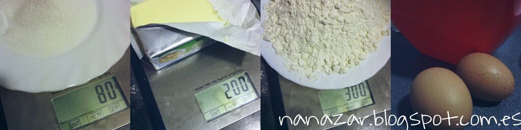 Después mezclamos 80 gramos de azúcar, 300 gramos de harina, 2 huevos y 200 gramos de mantequilla. Para que sea más sencillo de mezclar con el resto de ingredientes, poner la mantequilla en un vaso y calentarla unos segundos en el microondas para que se derrita.
