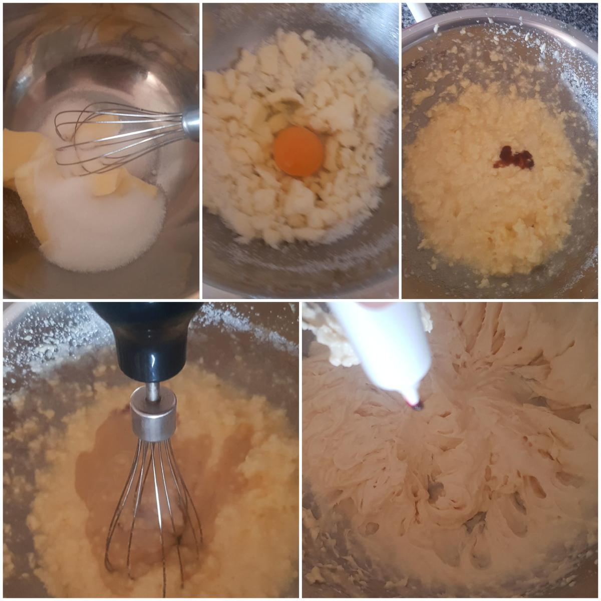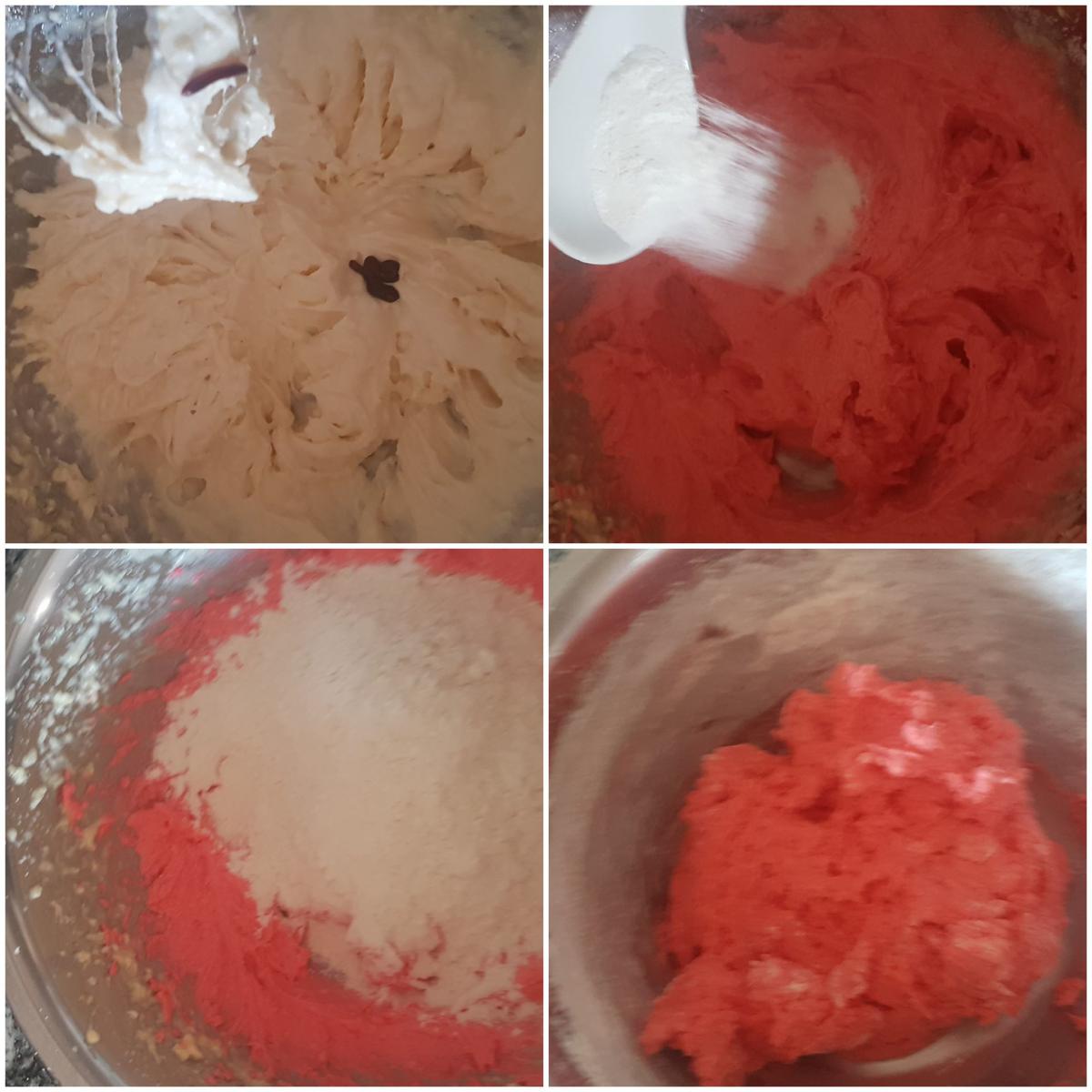 Añadir ingredientes Cuando tengáis la mezcla cremosa le echáis las gotitas de colorante, esto al gusto, yo le eché 4 gotitas, mezcláis bien hasta que os quede una crema homogénea. Luego le echáis, el bicarbonato, la levadura, la sal y la harina. Mezcláis bien con al ayuda de una espátula.