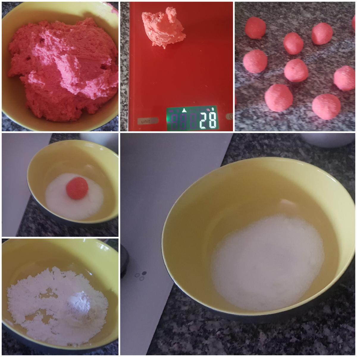 Hacer las bolitas Hacemos las bolitas cogiendo pedacitos de masa, yo las pesé para que me salieron más o menos igual, hacemos las bolitas, las rebozamos primero por azúcar normal y luego por azúcar glass, y las ponemos encima de la bandeja con papel de horno. Así con todas. Dejar un par de dedos de separación entre una y otra para cuando crezcan en el horno.