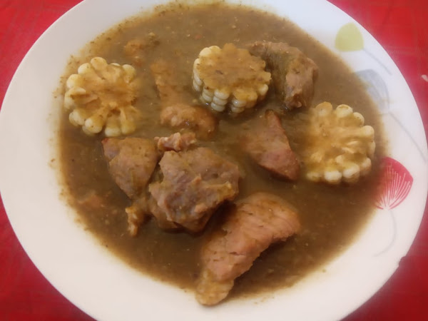 5.- Agrégalos a la carne, también 2 tazas de agua, para que hierva la carne y se termine de cocer, corta el elote en ruedas y viértelo en la salsa