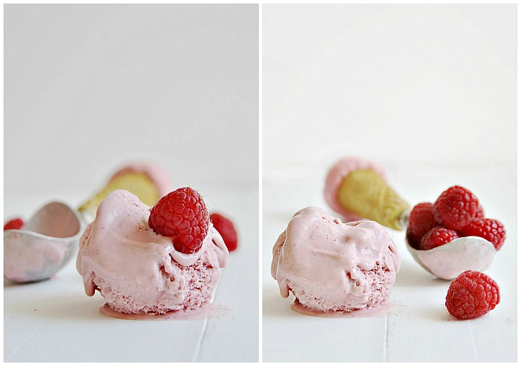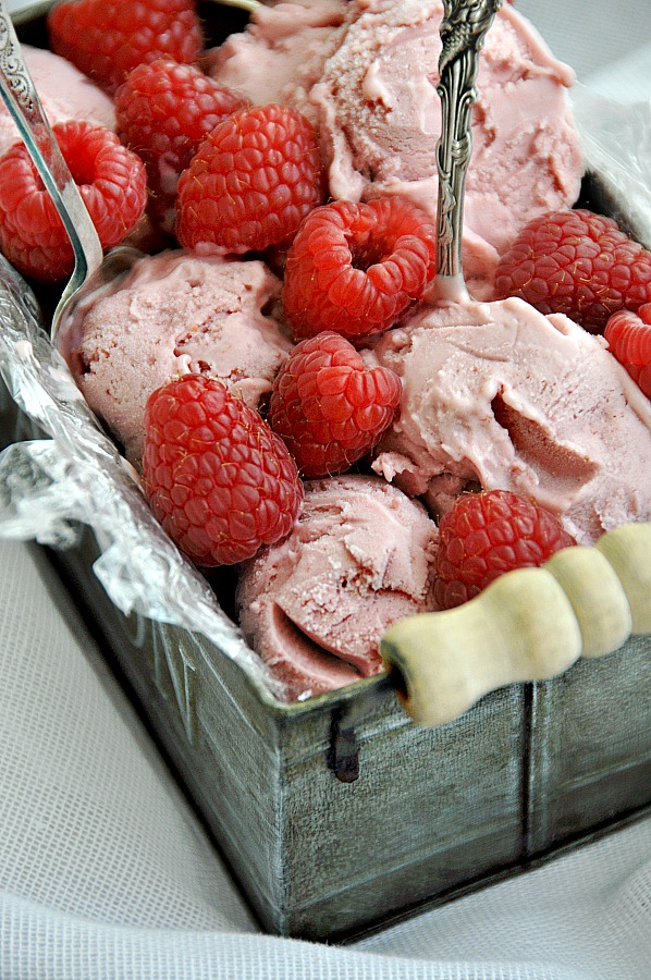 - Una vez añadido el puré de frambuesas, vierta la mezcla en un recipiente de metal (previamente enfriado en el congelador), tápelo con papel film y guárdela en el congelador 1 hora. Pasado la hora sáquelo y bátalo con una batidora eléctrica a alta velocidad 2 minutos. Vuélvalo a poner en el recipiente de metal alíselo, póngale el papel film transparente y vuelva a ponerlo en el congelador. Repita este paso 3 o 4 veces, para romper los cristales de hielo que se forman y el helado tenga la textura cremosa y suave que buscamos. Una vez que esté hecho puede pasarlo a un recipiente plástico con tapa. Tápelo y déjelo en el congelador mínimo 4 horas.