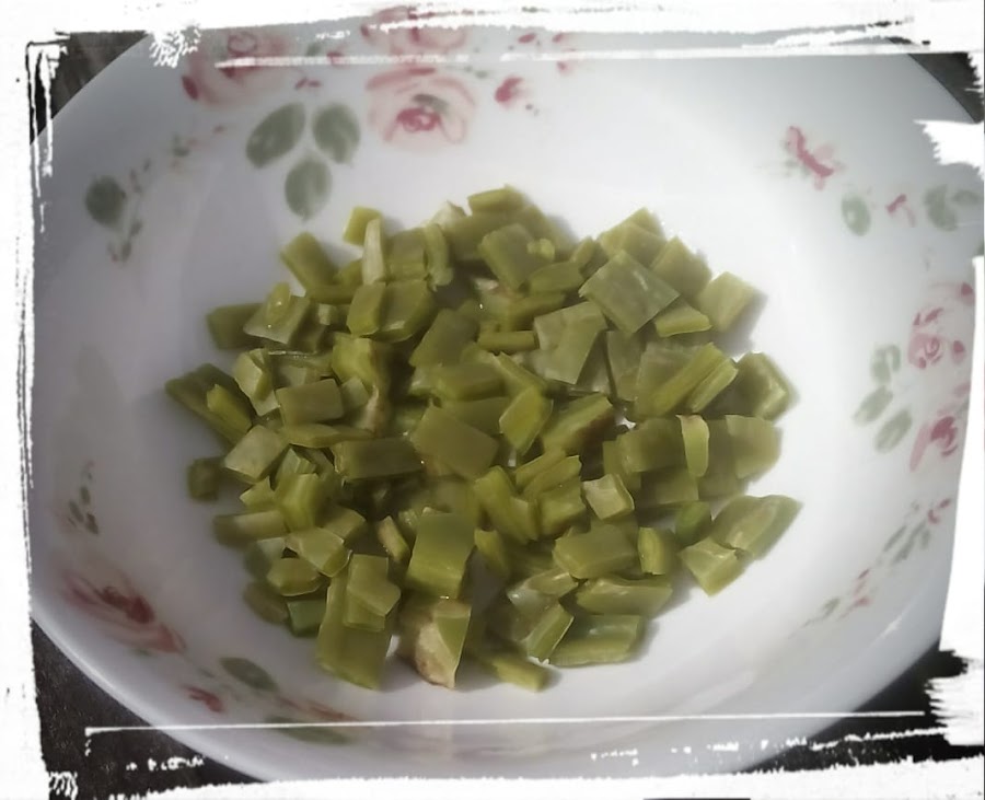 Pon en un recipiente los nopales cocidos, la cebolla, el chile, el qeso y los huevos uno a uno.