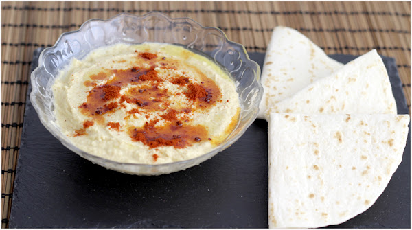 2.-Si lo deseamos, regamos con un chorrito de aceite de oliva y espolvoreamos con pimentón dulce o picante. Acompañamos de pan de pita o tortillas de trigo para mojar.