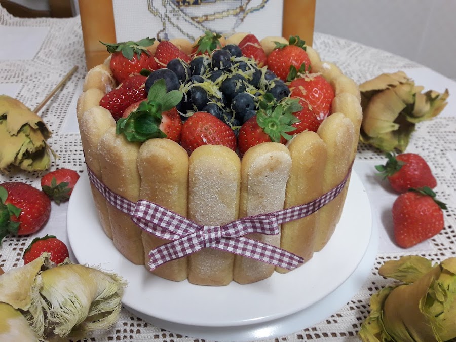 Los bizcochos los puse antes de hacer la tarta, aunque he visto que se pueden poner después al desmoldar, eso al gusto. Y para decorar las frutas que más gusten o como mi hija que la acompañó con mermelada de fresa casera.