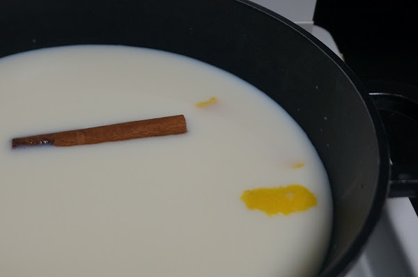 Del litro de leche, cogemos un vaso de leche y reservamos. El resto lo pondremos a calentar en una cazuela con la rama de canela y la cáscara de limón, lo dejamos cocer a fuego suave unos minutos, apagamos y lo dejamos reposar 10 minutos.