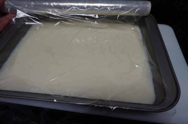 Cuando veamos que ya está, apagamos el fuego, preparamos un molde cuadrado. Mojarlo con un poco de agua o mantequilla y echar la crema, tapamos con film lo dejamos templar y lo metemos a la nevera hasta que cuaje unas 3-4 horas o de un día para otro.