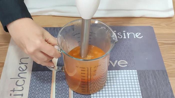 Pasaremos toda la salsa, excepto el laurel, al vaso batidor, donde la trituraremos hasta dejarla con la textura que nos guste.