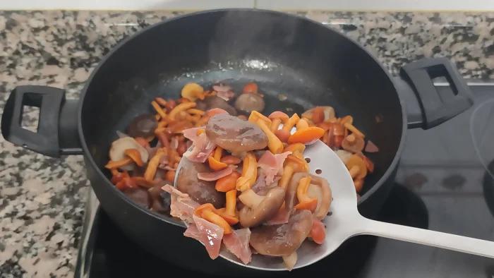 6Para acompañar, prepararemos unas setas salteadas con una pizca de aceite y, una vez tiernas, les añadiremos un poquito de jamón picado.
