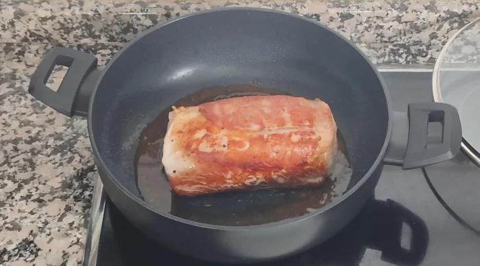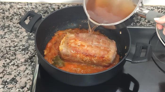 5En cuanto el líquido rompa a hervir, colocaremos una tapadera y dejaremos que lomo y salsa cuezan juntos.