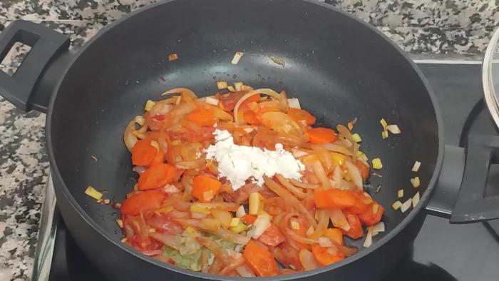 Pondremos ahora en el sofrito una cucharada sopera rasa de harina y salteamos todo junto durante un par de minutitos, cuidando de que la harina no llegue a tostarse.