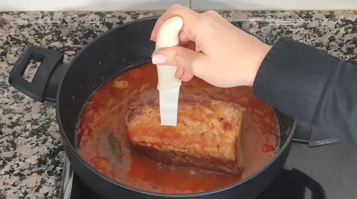 Pasados 20 minutos, destaparemos, le damos la vuelta al lomo y comprobamos si hay suficiente líquido en la cazuela y, si fuera necesario, añadiríamos más. De nuevo tapamos y dejamos cocer otros 15 o 20 minutos… y comprobamos el punto de cocción de la carne introduciendo un cuchillo.