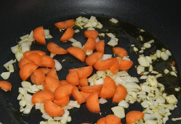 Ponemos a calentar el aceite en una sartén honda. Picamos la cebolla en trozos pequeños y la doramos un poco mientras limpiamos la zanahoria.