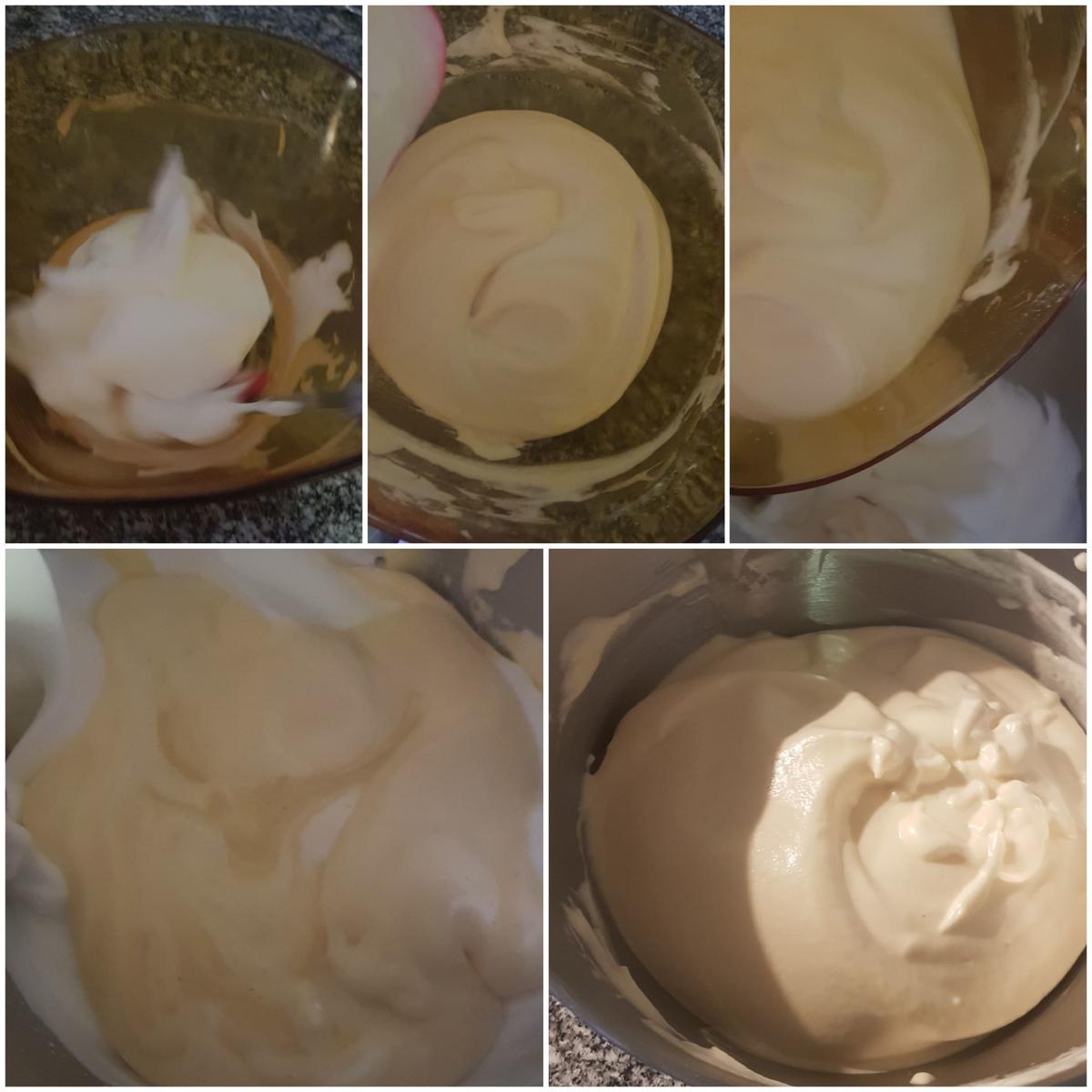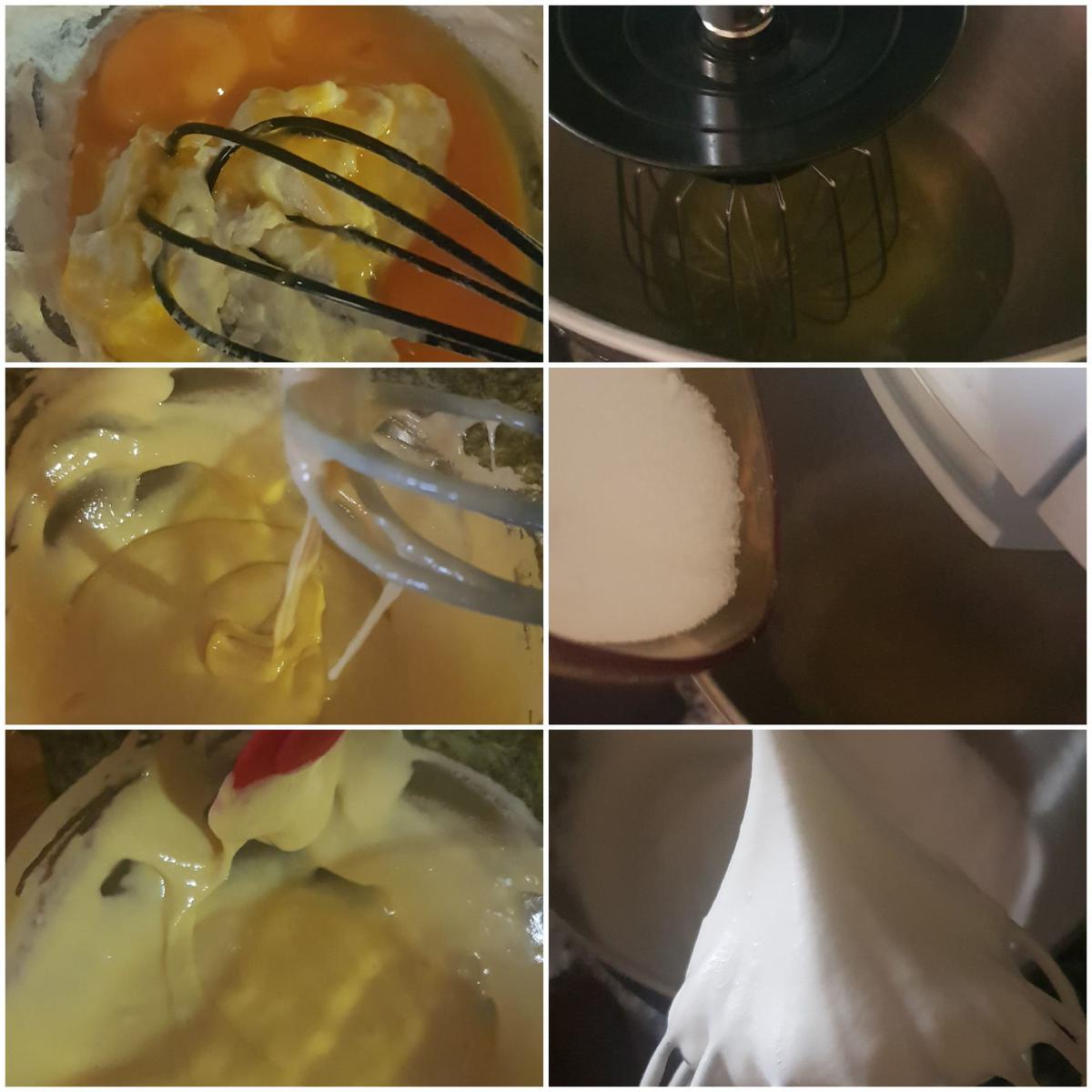 Separar las yemas de las claras Separamos las claras de las yemas, y reservamos las claras. Las yemas se las agregamos a la mezcla anterior y removemos bien con las varillas. Las claras las batimos a punto de nieve con el azúcar y el zumo de limón o crémor tártaro como en mi caso.
