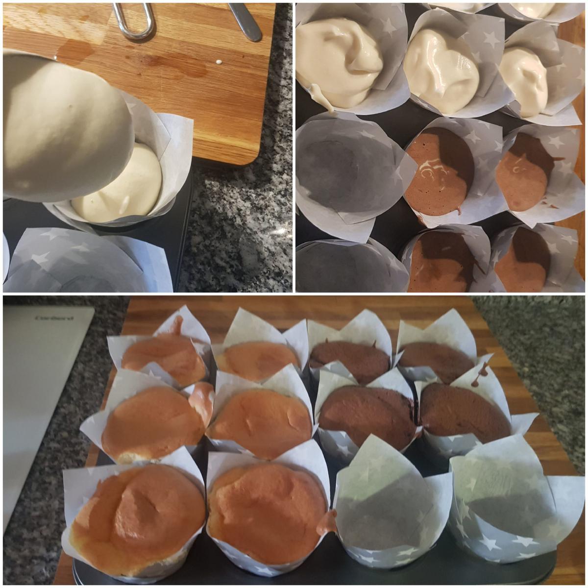 Al horno! Ahora llenamos los capacillos con la mezcla 3/4 de su totalidad, yo me ayudé con una cuchara grande. Introducimos en el horno que ya tenemos precalentado y horneamos durante 15-20 minutos dependiendo del horno.
