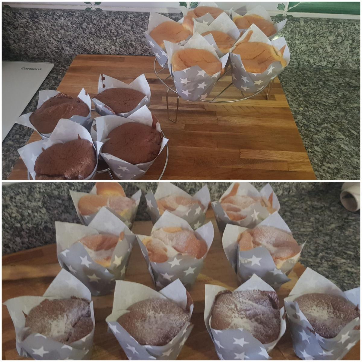 Yo en mi caso por probar… ya sabéis que suelo hacer estas cosas, preparé 4 Muffins de chocolate. Solo añadí a la mezcla un par de cucharadas de cacao en polvo tamizado. Recomendación: Yo puse esas dos cucharadas de cacao cuando ya tenía toda la mezcla junta, es mejor poner el cacao antes de juntar la mezcla de las yemas con las claras montadas por que si no se bajan, lo que pasa es que a mí se me ocurrió en el último momento y se bajó un poco la mezcla pero están buenísimos igual.