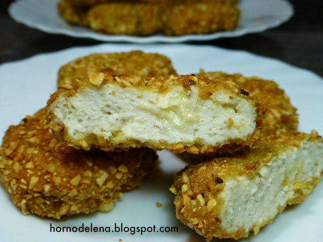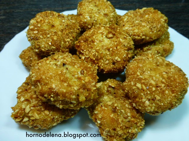 Pasamos nuestros nuggets por el huevo batido primero y luego por la mezcla del pan y la almendra. Freímos a fuego medio y cuando se doren les damos la vuelta. Sacamos a papel absorbente.