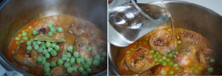Añadimos el vaso de agua y la pastilla de caldo y los guisantes, pueden ser congelados.