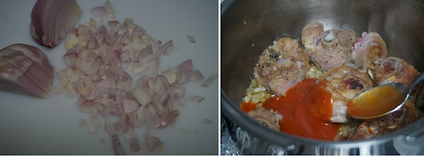 En la misma olla pondremos un poco más e aceite a fuego medio, picamos la cebolla y la incorporamos a la olla junto con la carne, removemos lo dejamos un par de minutos y añadimos el tomate frito y la hoja de laurel. Removemos.