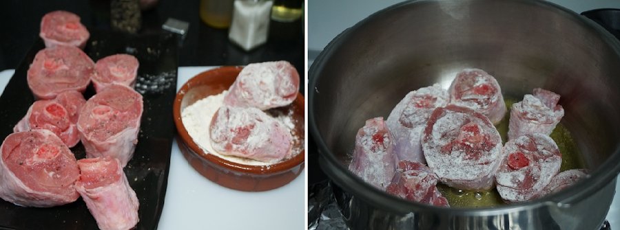 Empezaremos el osobuco de pavo en salsa poniendo sal y pimienta, pasamos por harina los trozos. Ponemos la olla con un chorro de aceite a fuego fuerte cuando esté caliente doramos los trozos de osobuco por los dos lados.