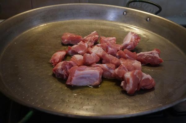 Ponemos la paella con un buen chorro de aceite y doramos la costilla, a fuego medio.