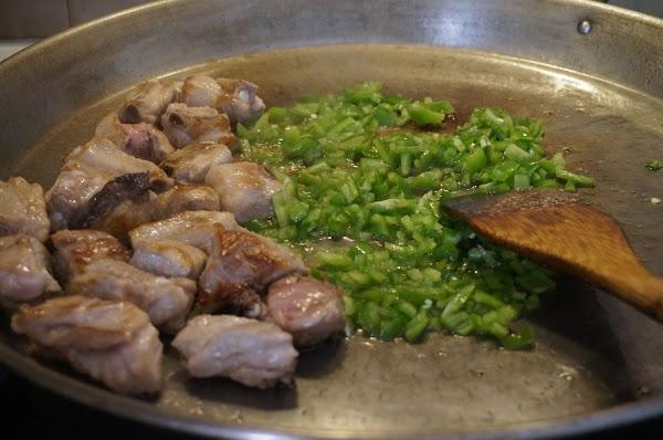 Cuando empieza a dorarse echaremos el pimiento verde picado.