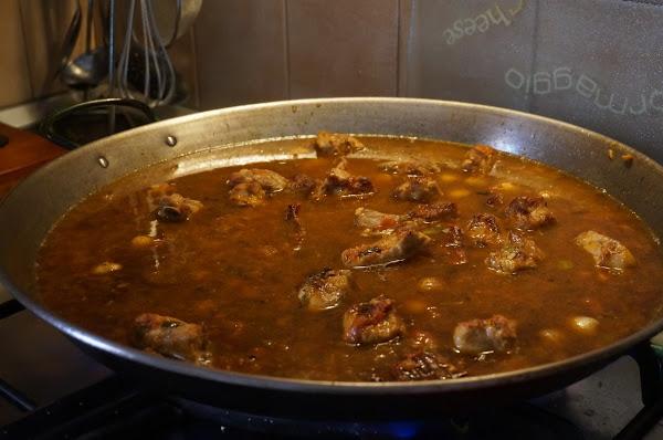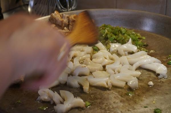 Lo dejaremos pochar un poco, lo pondremos en un lado con la costilla y saltearemos la sepia o el calamar a trozos.