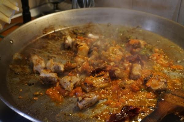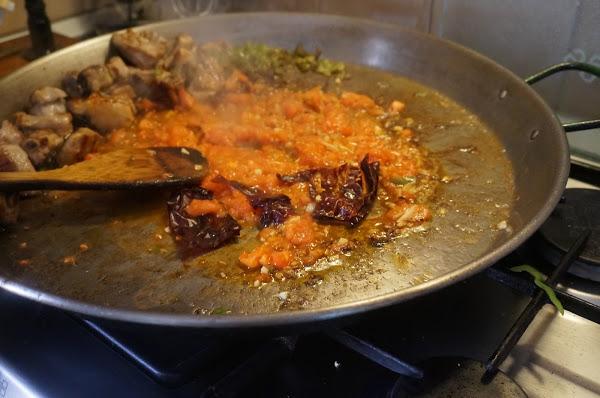 Troceamos la ñora y la echamos al sofrito, es opcional . La podemos sacar cuando el arroz este a medio hacer, pues ya habrá soltado todo su sabor.