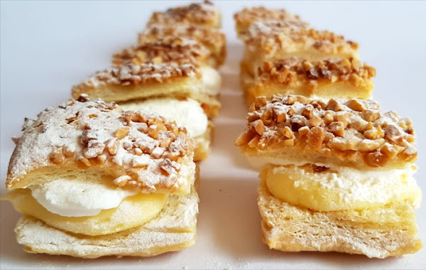 El postre original es una mezcla de capas doradas y crujientes del más fino hojaldre, rellenas de una crema pastelera muy fina y coronadas de almendra laminada. Si nos animamos a preparar hojaldre casero nos saldrá un postre redondo, pero si no queremos complicarnos podemos usarlo congelado.Ingredientes: