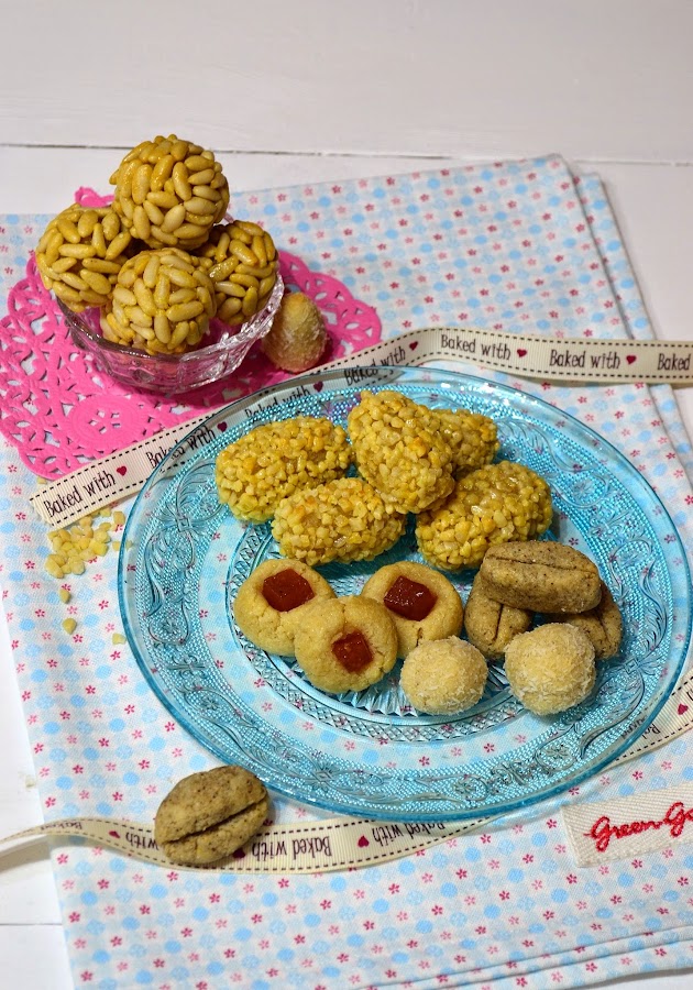 IMPORTANTE: Sin duda lo que he encontrado más laborioso es el rebozado en los piñones y la almendra. Para ello, el truco que mejor me ha funcionado es mojar las bolas de masa en huevo batido y después pasarlas por los frutos secos.