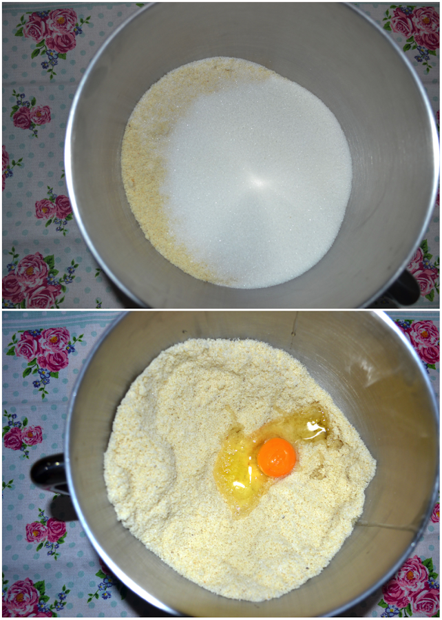 1. Ponemos en un bol, la harina con el azúcar y mezclamos con las manos hasta que se integren.