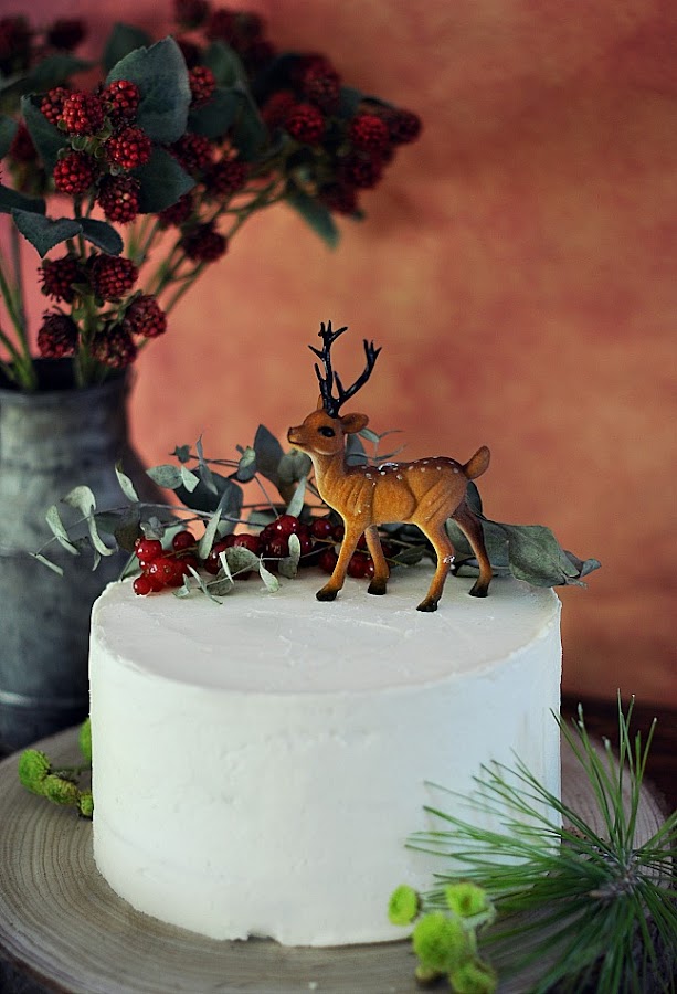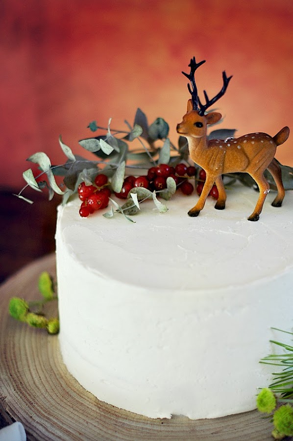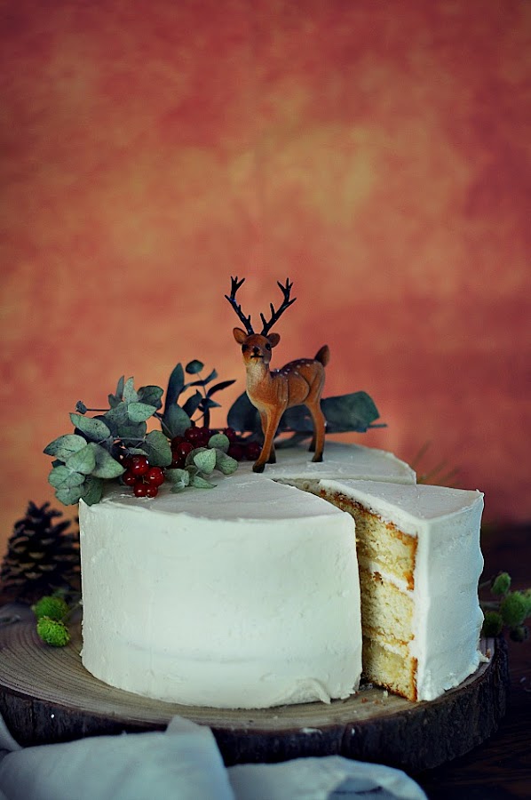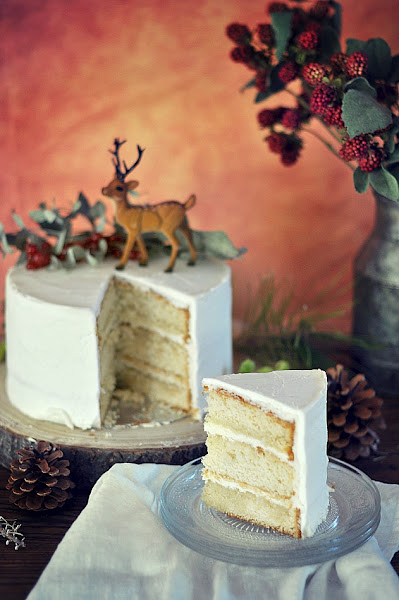 Debo confesar que esta receta la he hecho con alguna reserva porque había leído una gran variedad de versiones, no en los ingredientes sino en la elaboración. Generalmente según el tipo de bizcocho hay unos pasos a seguir y ésta en particular se unían los ingredientes según quien la hiciera de manera diferente. He hecho un estudio y seguido unos pasos lógicos, luego crucé los dedos esperando a que creciera como es debido y su estructura fuera suficientemente esponjosa y resistente. Bueno, ha funcionado. Espero que les guste este pastel de masa blanca que a pesar de la decoración tan otoñal que le he hecho, se presta muchísimo para una blanca Navidad, así que tenerlo en cuenta para las próximas fiestas que se avecinan.