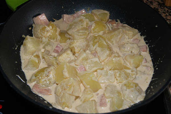 Como siempre, es una idea sencilla y fácil, además de muy rica. Unas patatas con jamón cocido, cocinadas en crema de soja. Un primer plato excepcional y económico.