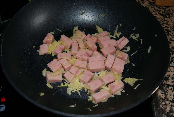 En una sartén calentamos un poco de aceite. Pelamos y cortamos la cebolla lo más pequeña posible y la incorporamos a la sartén. Removemos de vez en cuando para que coja color y se haga bien. Hacemos dados con el jamón cocido y lo añadimos. Removemos un poco para que se vaya mezclando todo.