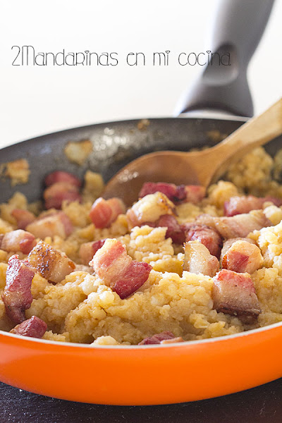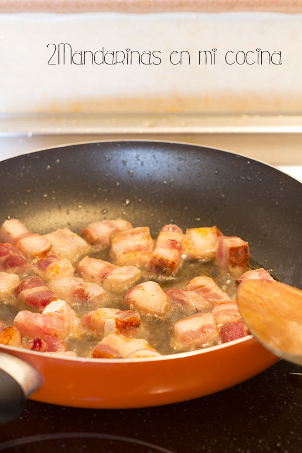 2. Mientras tanto cortamos en trozos pequeños las dos lonchas de la panceta adobada y la ponemos al fuego en una sartén junto con el aceite. Freímos a fuego fuerte hasta que la panceta esté bien doradita.