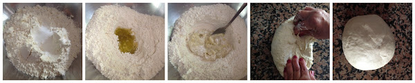 Ponemos en un bol la harina con la sal y el bicarbonato, mezclamos bien y agregamos el aceite. Removemos y comenzamos a integrar el agua, poco a poco para no pasarnos. Si nos pasamos con el agua le podemos añadir harina, pero lo ideal es que no debamos agregar nada de harina, sólo la que usamos en la superficie de trabajo. Volcamos la masa en la encimera (mesada) enharinada y amasamos hasta obtener una masa suave que no se pega a los dedos.
