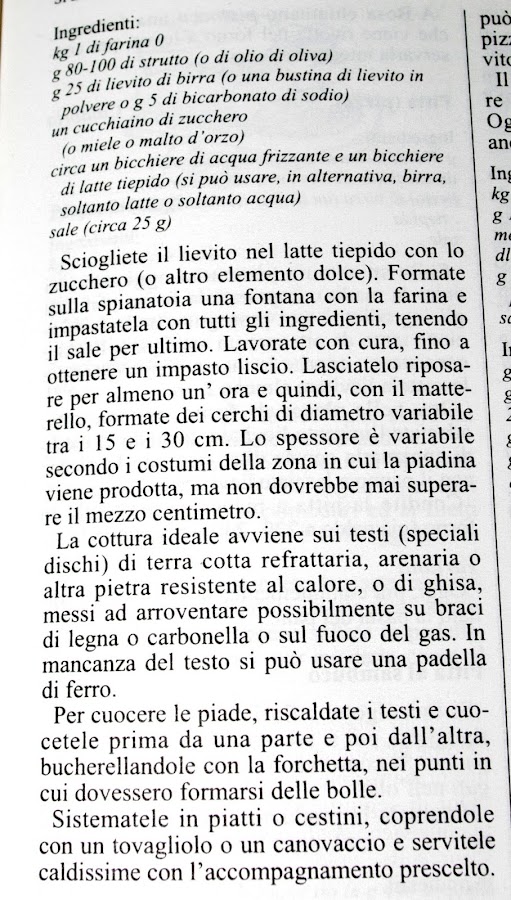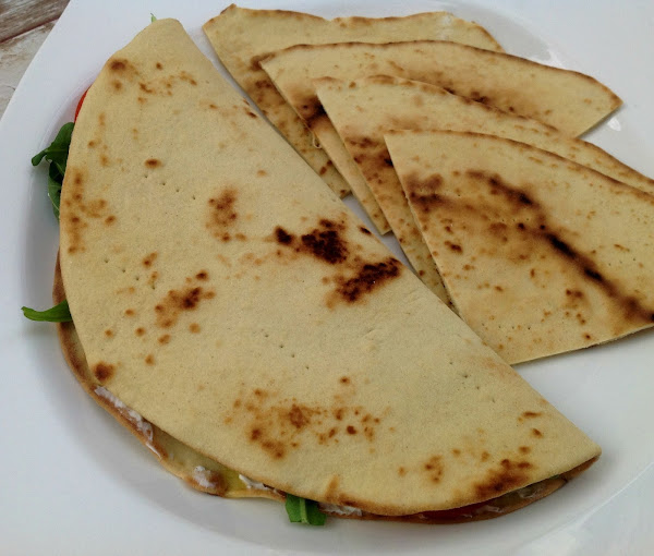 La piadina es un pan plano que se elabora con harina de trigo y se cocina sobre placas de metal o piedras refractarias. Y según Wikipedia, es la comida nacional de los romañoles. Normalmente se presenta rellena y doblada por la mitad, pero también se suele comer como pan, acompañando los diferentes platos durante la comida.