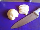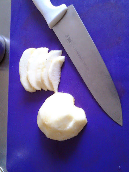 Pelar y cortar las manzanas en lascas y sumergir en agua con unas gotas de limón mientras las vamos cortando para evitar que se oxiden, escurrir el agua