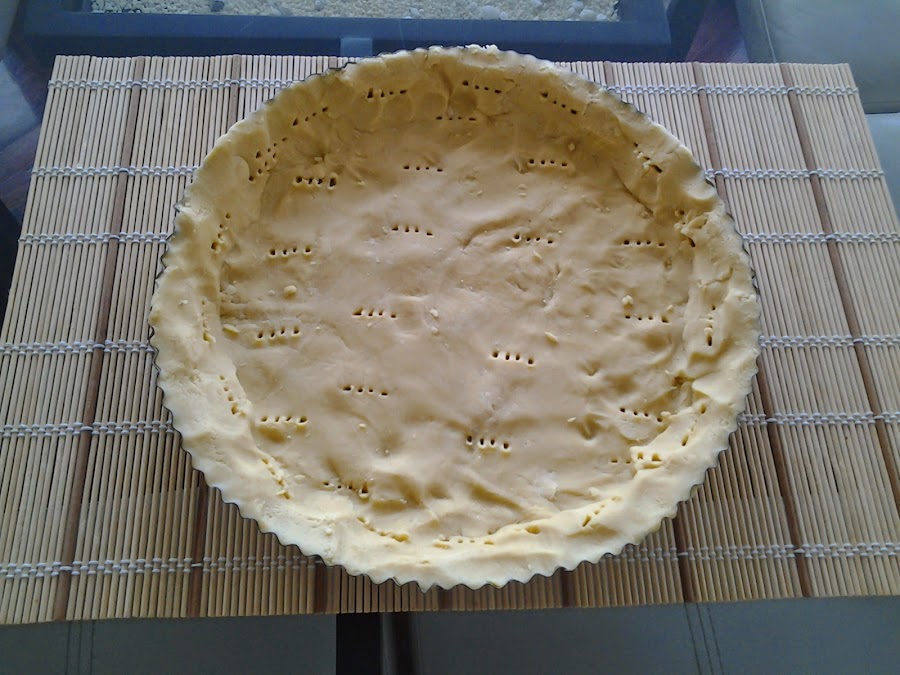 Empezaremos preparando la masa para pie y sobre la mesa colocaremos la harina , haremos un hueco en el centro y aquí colocaremos la mantequilla cortada en cubos (es importante que la mantequilla esté bien fría ) ,el huevo, el agua helada y la pizca de sal con las manos vamos a integrar todo hasta que nos quede una masa homogénea y la llevaremos a refrigerar por 30 minutos como mínimo para luego estirarla y cubrir la base de un molde desmontable de 22 cm de diámetro ,pinchamos con un tenedor para que pueda salir el vapor y no se nos hinche la masa y la ponemos en el horno por 15 a 20 minutos a 180 °C .