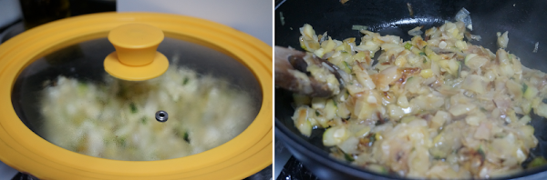 Ponemos una sartén con un chorro de aceite de oliva a fuego medio, añadimos los puerros y el calabacín, dejamos cocinar hasta que se dore. Tapamos la sartén unos 5 minutos para que se haga vapor y se vaya cocinando sin necesidad de poner mucho aceite, quitamos la tapa, añadimos un poco de sal y dejamos se termine de cocinar, unos 5-8 minutos más.