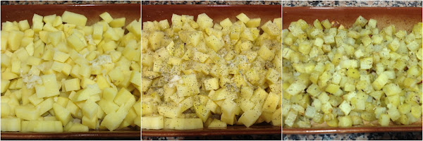 Pelamos y troceamos en cubos pequeños las patatas y las ponemos en una fuente para horno. Añadimos el ajo troceado, sal pimienta y romero. Agregamos las dos cucharadas de aceite y removemos bien. Cocinamos en el horno a 180º durante 30 minutos. Retiramos del horno y removemos. Cocinamos durante 30 minutos más.