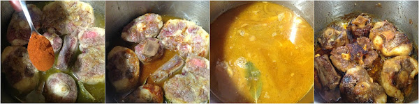 Una vez dorado, incorporamos el brandy y el vino blanco, junto al pimentón, removiendo bien. Por último agregamos el caldo de carne y el agua hasta cubrir. Subimos el fuego hasta que hierva y en ese momento bajamos el fuego a mínimo y cocinamos unas 3 horas en olla común, removiendo de vez en cuando para que no se pegue al fondo de la olla.