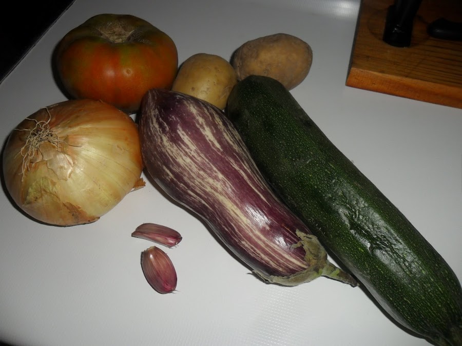 Cortamos la berenjena en rodajas finas y dejamos que suelte el amargor con un poco de sal, dejamos sobre papel de cocina mientras cortamos las patatas también a rodajas finas, las cuales vertemos un poco de agua y las ponemos en el microondas hasta que estén casi tiernas.