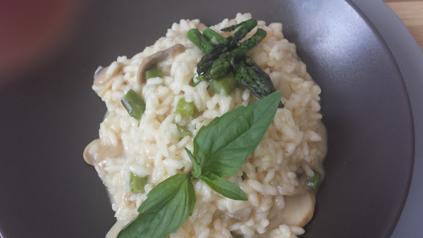 Servimos en un plato de presentación colocando el risotto ya emulsionado, las puntas de esparragos sobre este y unas hojas bonitas de albahaca para decorar.