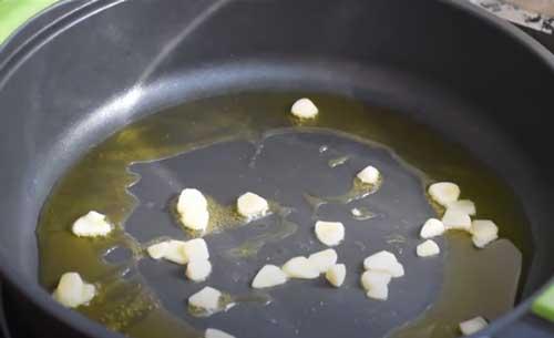 Ponemos en una sartén el aceite de oliva virgen extra, llevamos al fuego y cuando esté caliente echamos los dientes de ajos pelados y laminados.