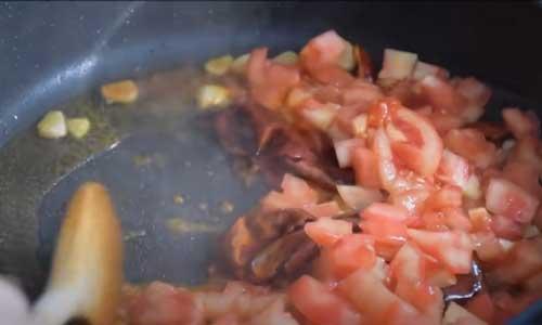 Así que seguidamente añadimos los tomates que los hemos pelado y troceado en dados pequeños. Si prefieres puedes rallarlo.